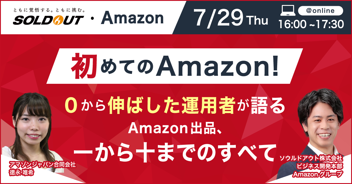 地方を含む日本全国の中小・ベンチャー企業の成長支援をデジタルマーケティング領域で展開するソウルドアウト株式会社(本社:東京都文京区 代表取締役会長CGO:荻原猛、以下ソウルドアウト)は、2021年7月29日(木)、8月19日(木)、9月2日(木)にオンラインセミナー『【ソウルドアウト・Amazon共催】初めてのAmazon出品!6か月間で注文数を0から583まで伸ばした運用者が語る、Amazonでの出品ノウハウセミナー』を開催いたします。